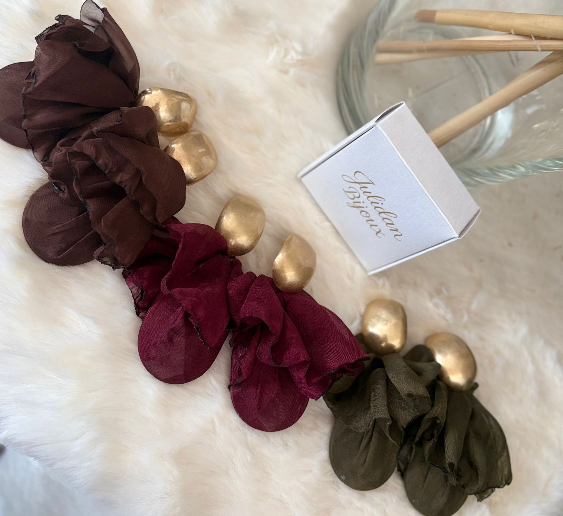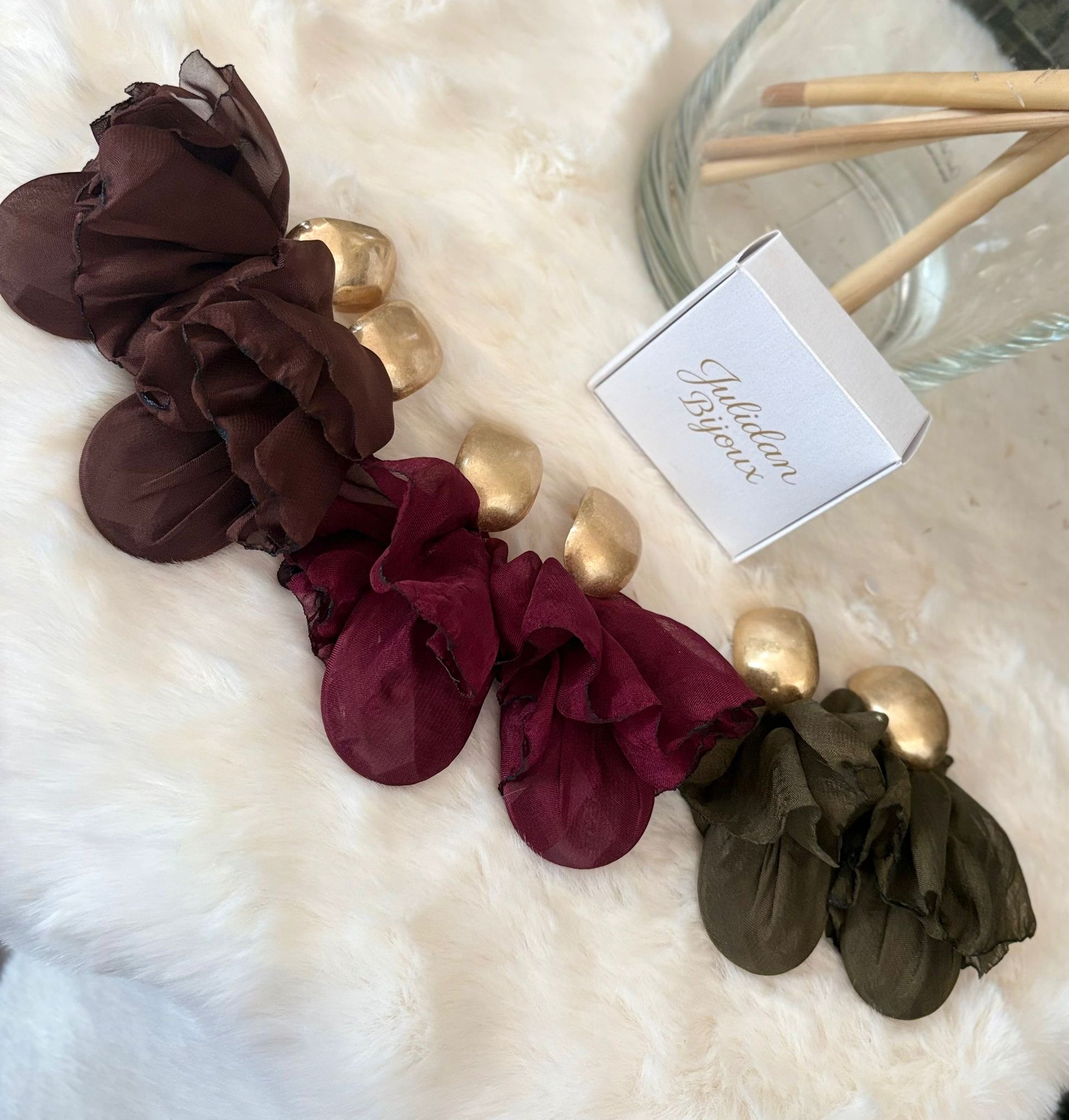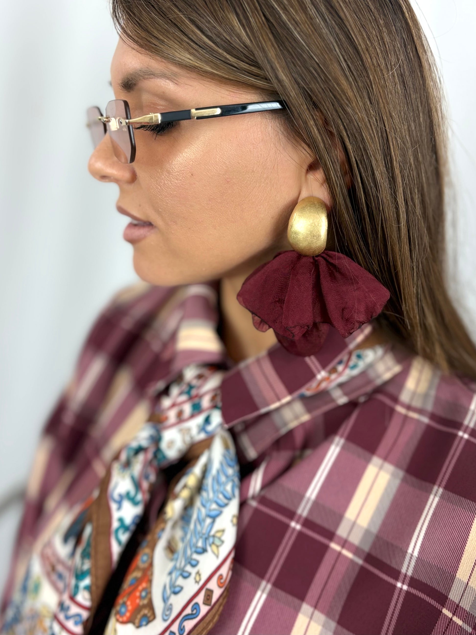 Orecchino pendente con elemento in metallo dorato martellato e parte inferiore in tessuto